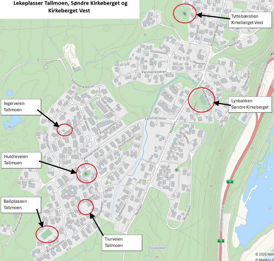 Oversikt over lekeplasser på Tallmoen, Søndre Kirkeberget og Kirkeberget vest. Totalt 6 lekeplasser.