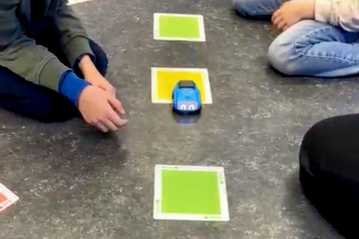 Vi har også brukt Sphero Indi, en liten robotbil som programmeres gjennom fargebrikker. Her har elevene planlagt ruter, testet løsninger og samarbeidet for å få roboten dit de ønsket.