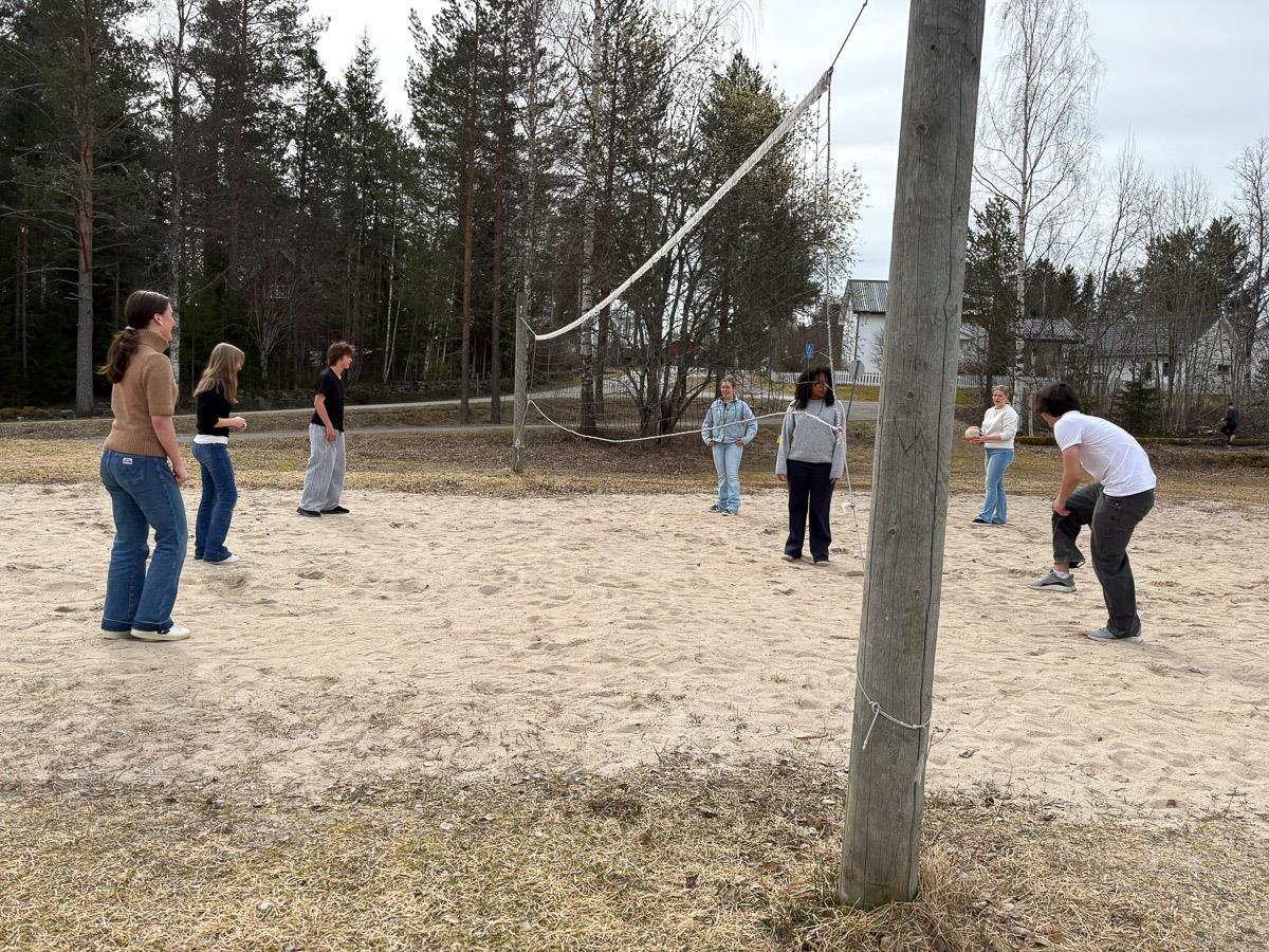 Volleyball på skolenNår sola titter fram, trekker elevene naturlig ut i friminuttene, og skolegården fylles av liv, latter og aktivitet. Noen spiller frisbeegolf, andre samles til fotball og volleyball, mens flere bare nyter sola sammen i solveggen med gode samtaler.